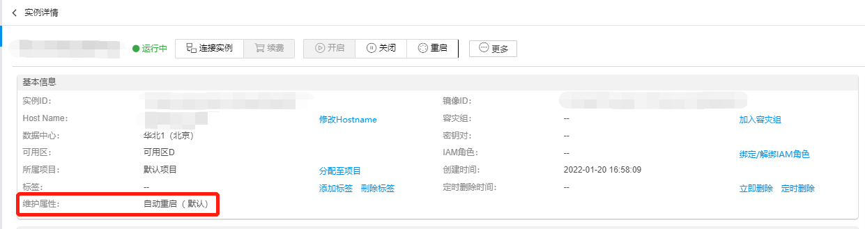 5、点击实例名称进入实例详情页,在基本信息>维护属性,可以查看该实例的维护属性。