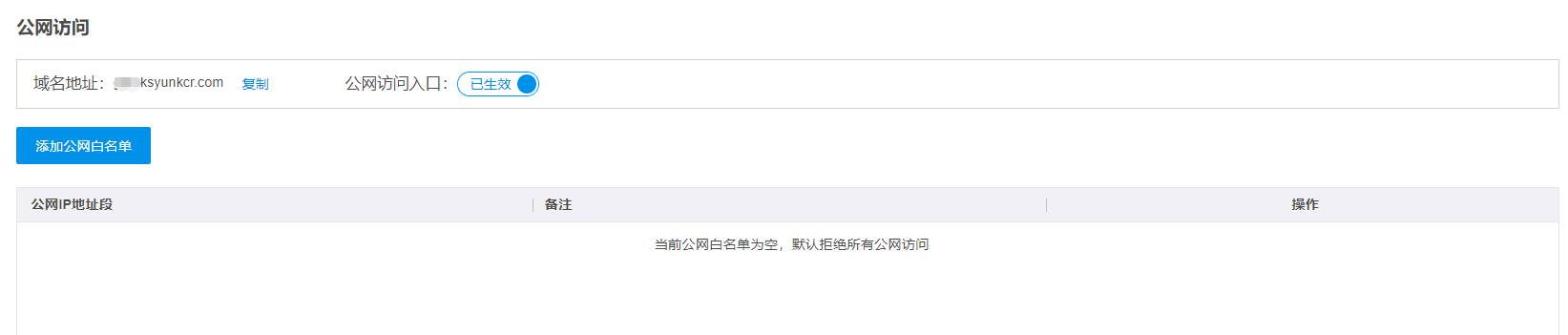 镜像服务KCR支持配置公网访问控制,可基于白名单策略限制来自公网环境的客户端对实例的访问,保障实例内的数据隐私安全,新创建的KCR企业版实例默认不开启公网访问入口。