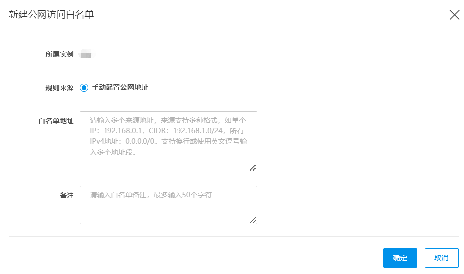 白名单地址:可输入多个来源地址,支持多种格式:单个IP/CIDR/所有IPV4;支持换行或使用英文逗号输入多个地址段。