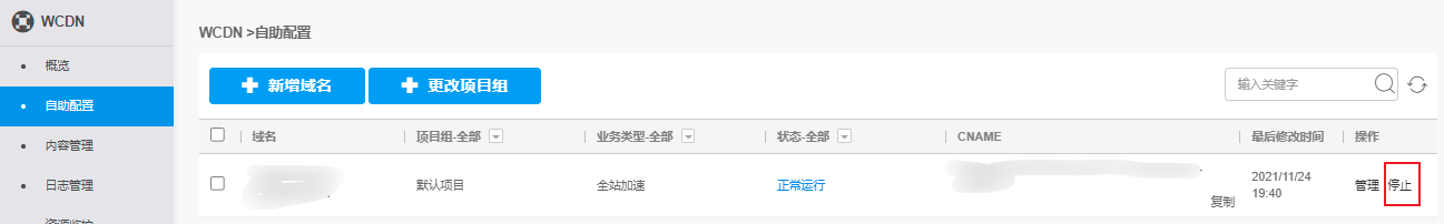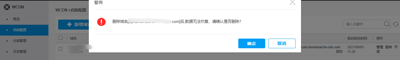 对于在WCDN控制台创建的,确定不再使用的域名,可进行删除操作,删除加速域名步骤如下:
