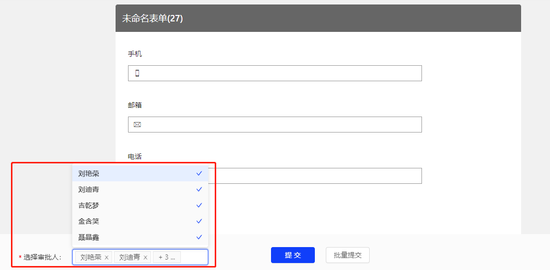 填写人或者有下一级审批流程的审批人在选择审批人时,可以选择多个审批人,选择范围不超出表单设置时指定的审批人,其中有任意一人审批表单就可以流入下一级。