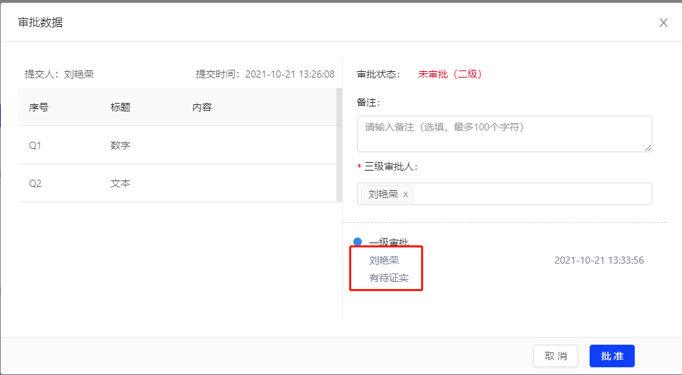 提交人在“我的提交”页面点击“查看记录”可以看到最后一级审批人的备注信息。