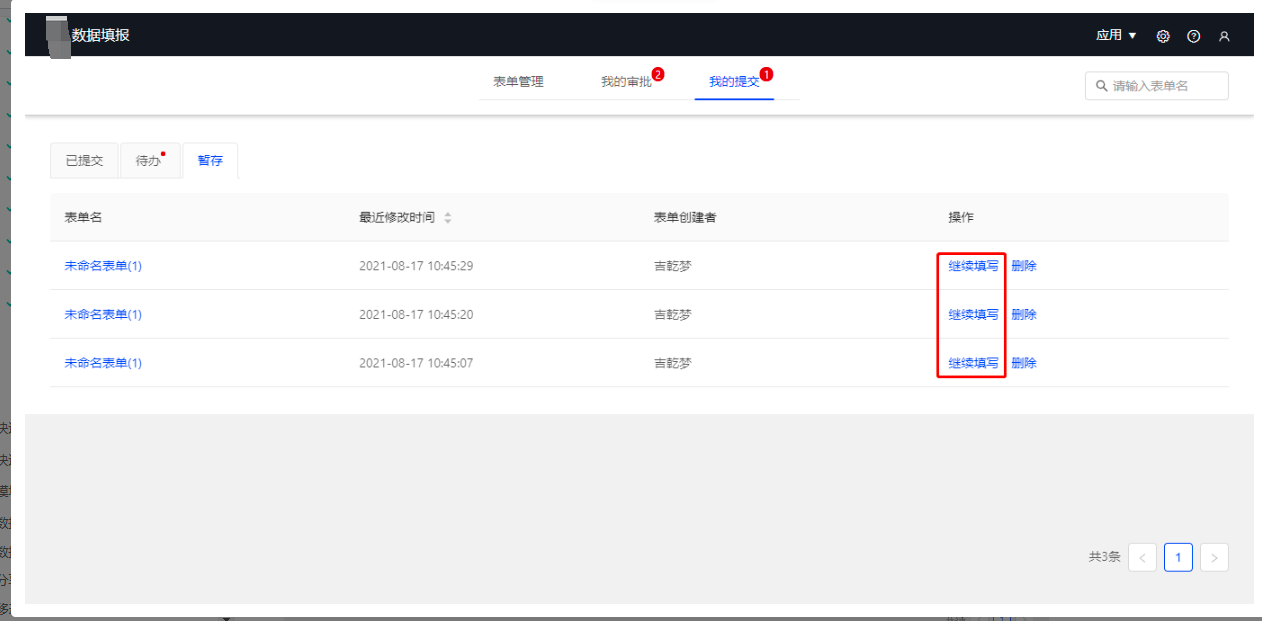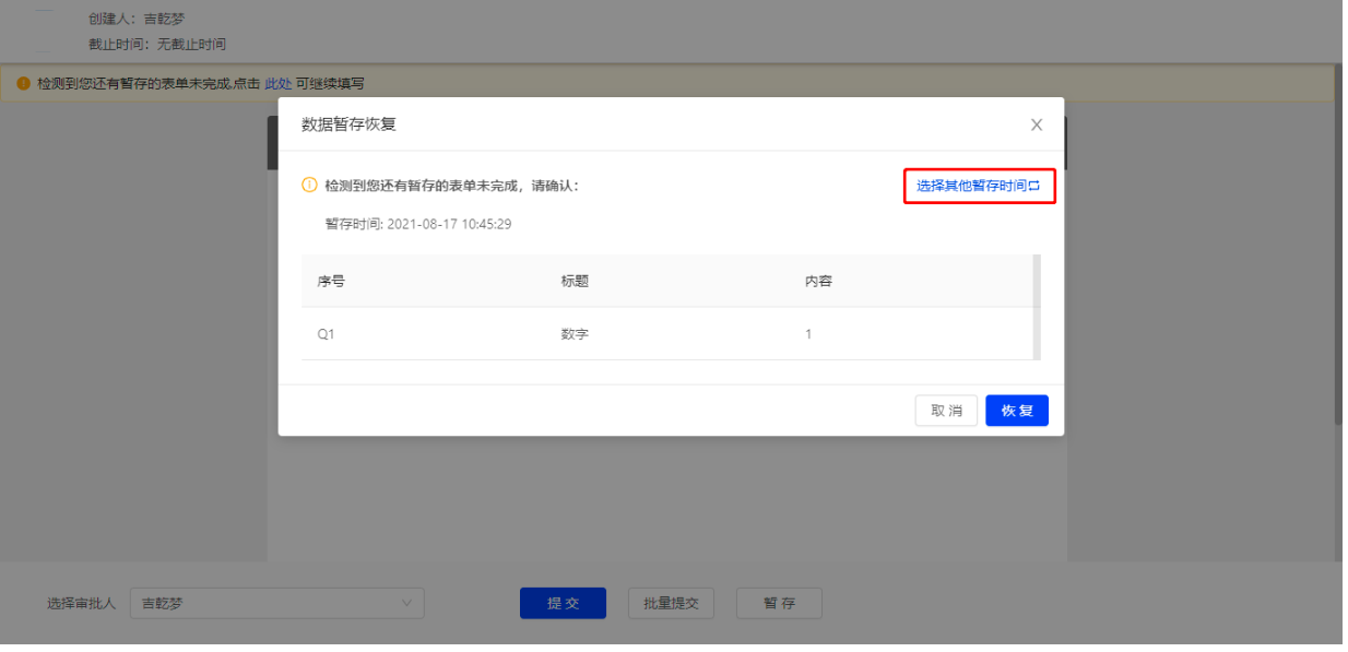 若没有点击继续填写,再次打开填写页面,可以选择数据暂存恢复。
