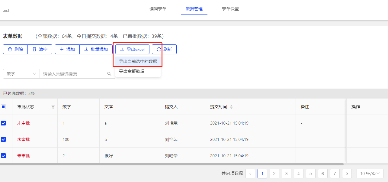 当选择数据后,点击“导出excel”选择“导出当前所选数据”,可以对部分数据进行导出。