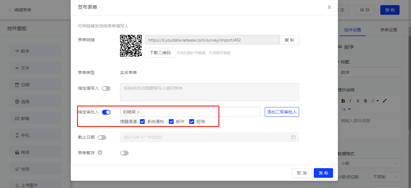 发布表单时,可以设置审批人的提醒渠道,审批人会收到待审批数据的消息。