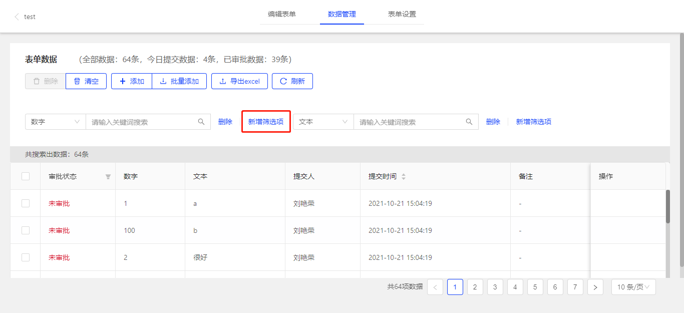 筛选条件:支持组合筛选 筛选数据时,点击“新增筛选项”可以对不同的字段进行组合筛选,结果取所有条件的交集。