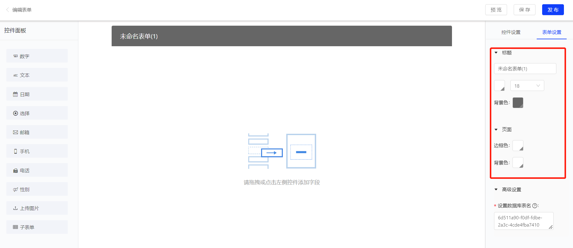 点击“表单设置”可以设置表单标题、标题颜色、标题字号、标题字体以及标题区域背景颜色。还可以对页面的背景色和边框色进行更换,点击后打开颜色面板可选择任意自定义颜色。