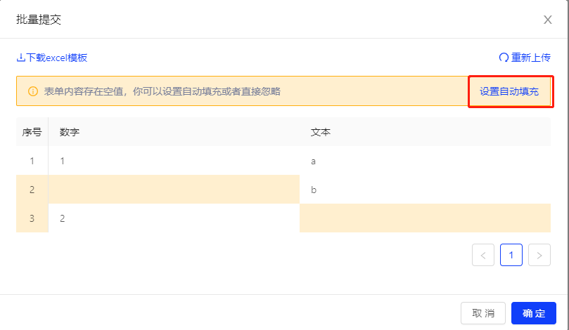 批量提交数据时,如果存在空值,可以选择直接忽略或者设置自动填充。