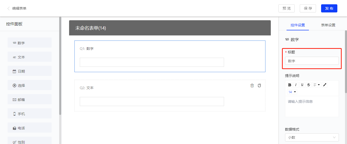 点击“控件设置”可以输入控件名,点击“表单设置”可以输入表单名。