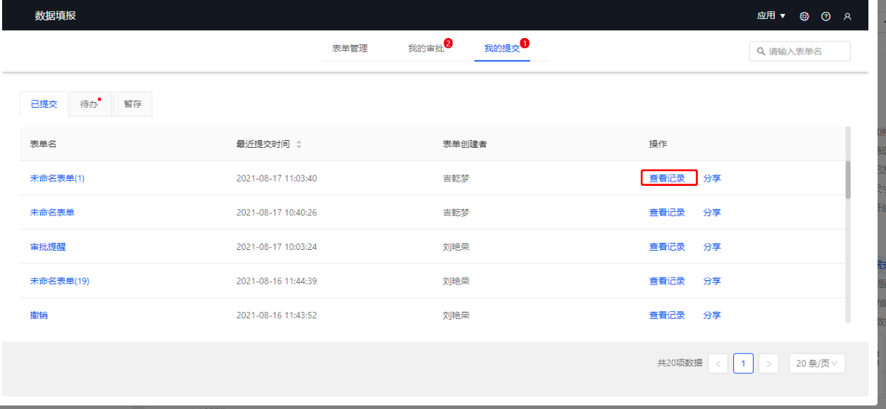 在“我的提交”下,点击“查看记录”按钮可以选择要撤销的数据。