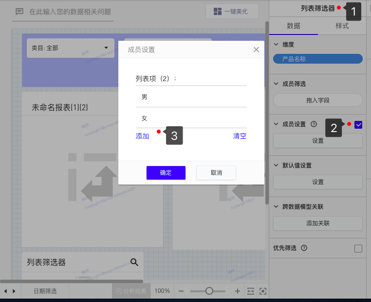 5、如果筛选维度可以枚举,此时也可以通过直接设置筛选器的默认值实现数据筛选,此时点击筛选器时产品将不会直接查询,而是直接使用给定的数据进行筛选。