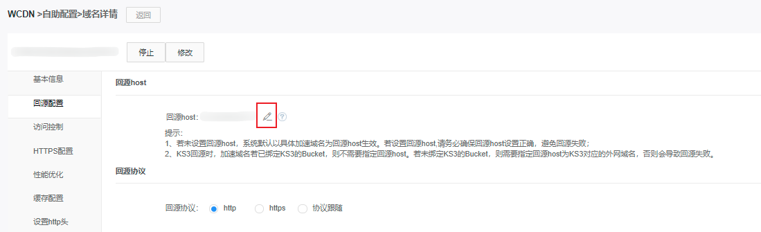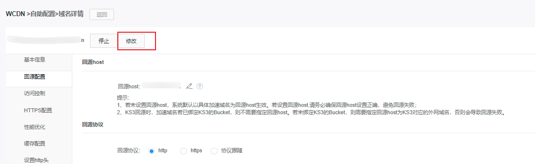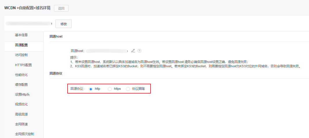 在【回源配置】栏中修改回源协议