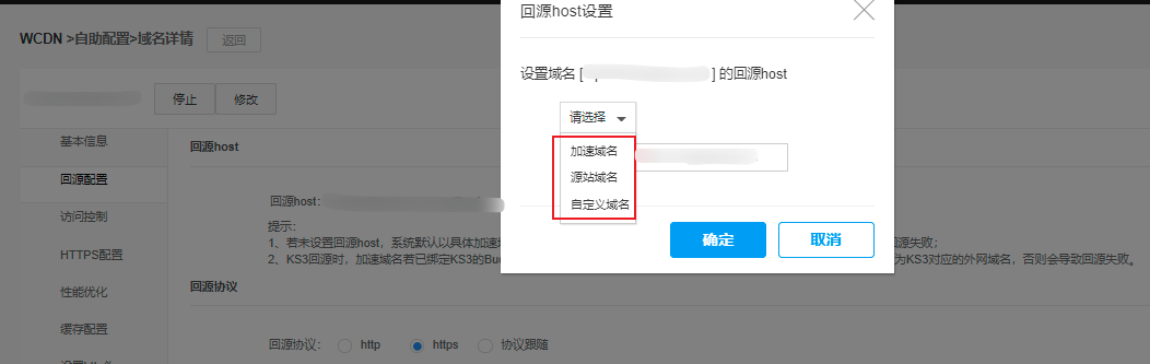在新建域名后,您可根据自身需求选择对应的源站、回源host及回源协议等配置。