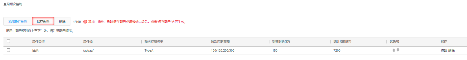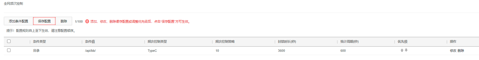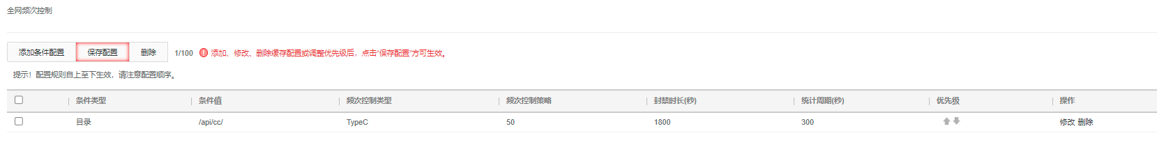 点击【添加条件配置】按钮,即可添加自定义条件规则的全网频次控制配置,在点击【确定】后,还可以调整不同条件规则的全网频次控制配置之间的优先级关系。在调整完成后点击【保存配置】方可生效。