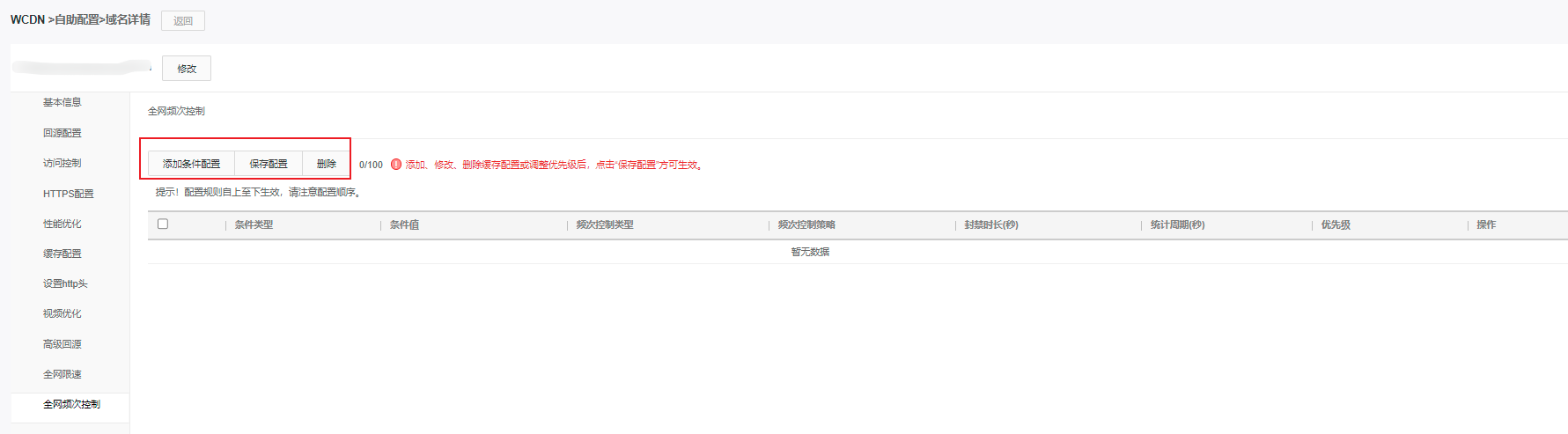 当该url在120秒内全网有100个以上的访问或者300秒内全网有200个以上的访问,则触发全网频次控制功能对该url的限制,WCDN在接下来的180秒内禁止全网任何网民ip对该url的访问,直接返回403状态码。