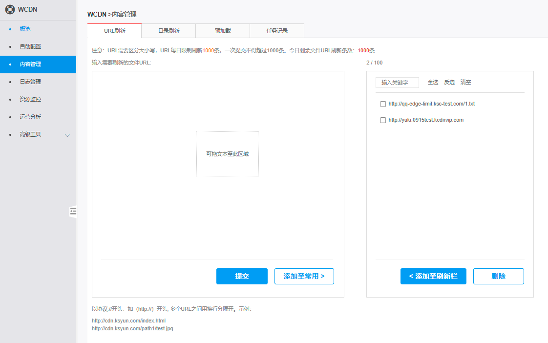 刷新分为目录刷新和URL刷新,各项操作条数每日均有相应的限制;