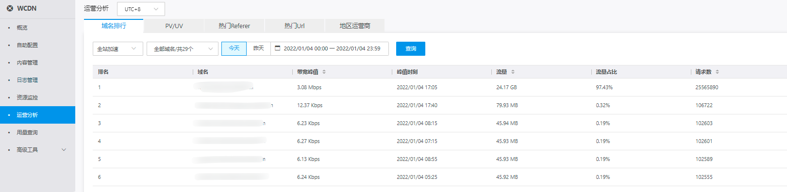 运营分析包括域名排行、PV/UV、热门Refer、热门URL、地区和运营商。