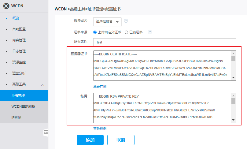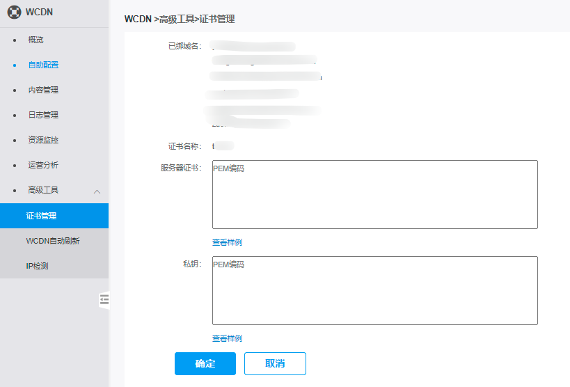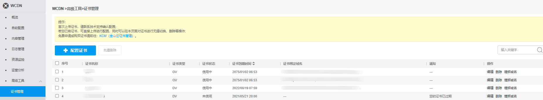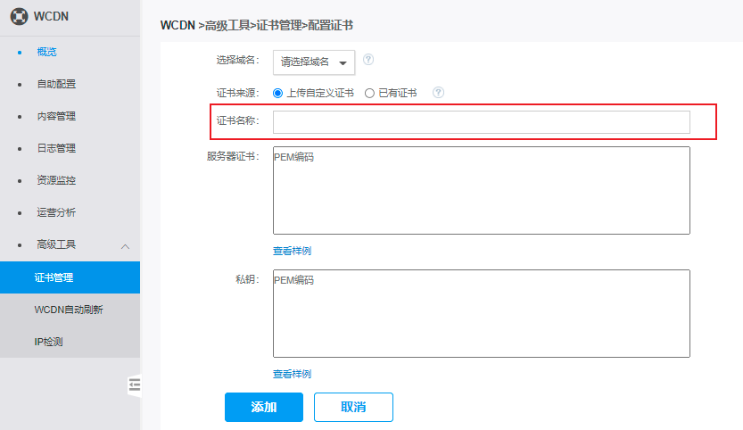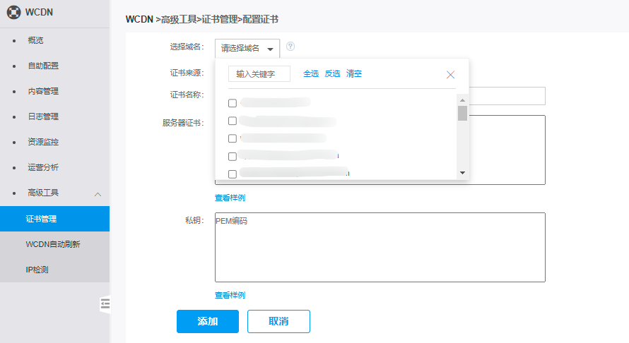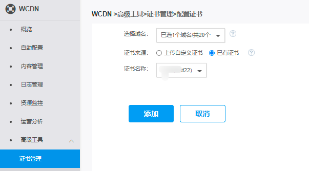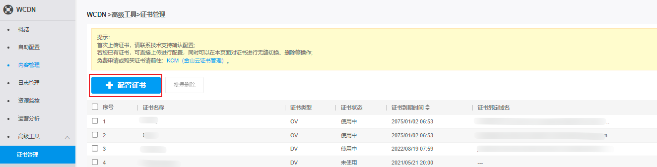 注意:本文档描述对象为WCDN控制台,不是SSL证书管理控制台。目前WCDN控制台和CDN控制台的证书管理是互通的,可以在每个控制台上配置这两个控制台全部的证书和域名。