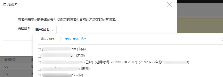 在证书管理页面,可通过点击证书列表里的【增绑域名】按钮给证书增加绑定新的域名(该证书可以绑定但还未绑定的域名,弹窗中的域名列表里的域名会附带是否已绑其他证书的信息):