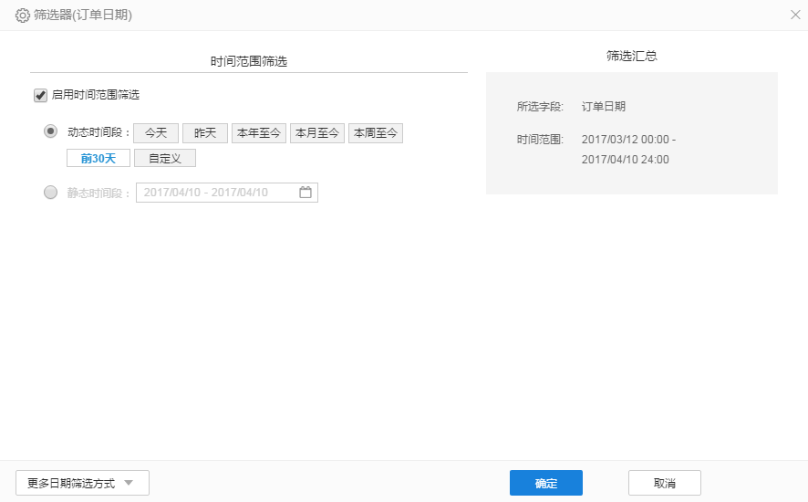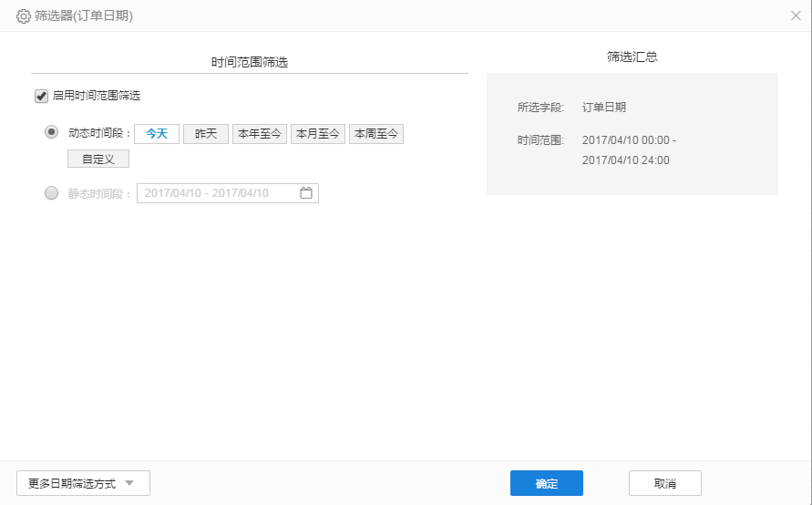 日期会动态变化。提供了5种动态时间段:今天、昨天、本年至今、本月至今、本周至今,还提供了自定义功能。
