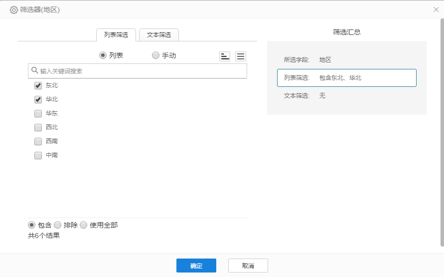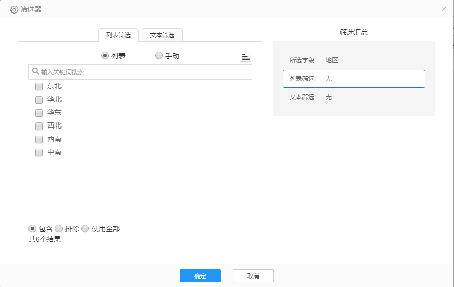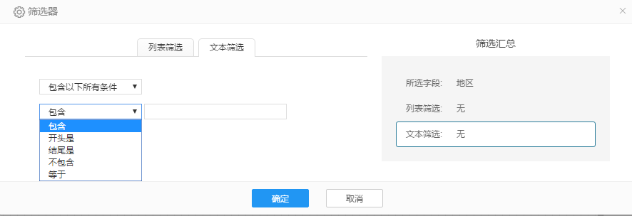 比如将维度“地区”拖入筛选器,将触发列表筛选和文本筛选
