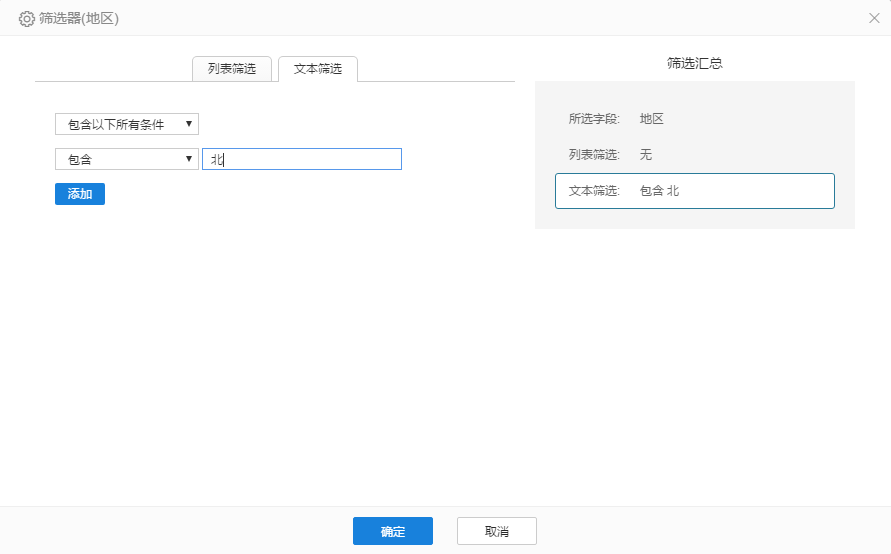 2)在文本选项中,输入包含“北”,则报告包含“东北”、“华北”、“西北”,以及未来新增含有“北”的成员