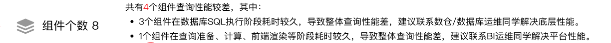 诊断完成后,诊断结论会根据组件耗时阶段判定性能差的原因,并告知阅览用户联系数仓或平台运维解决性能问题,例如: