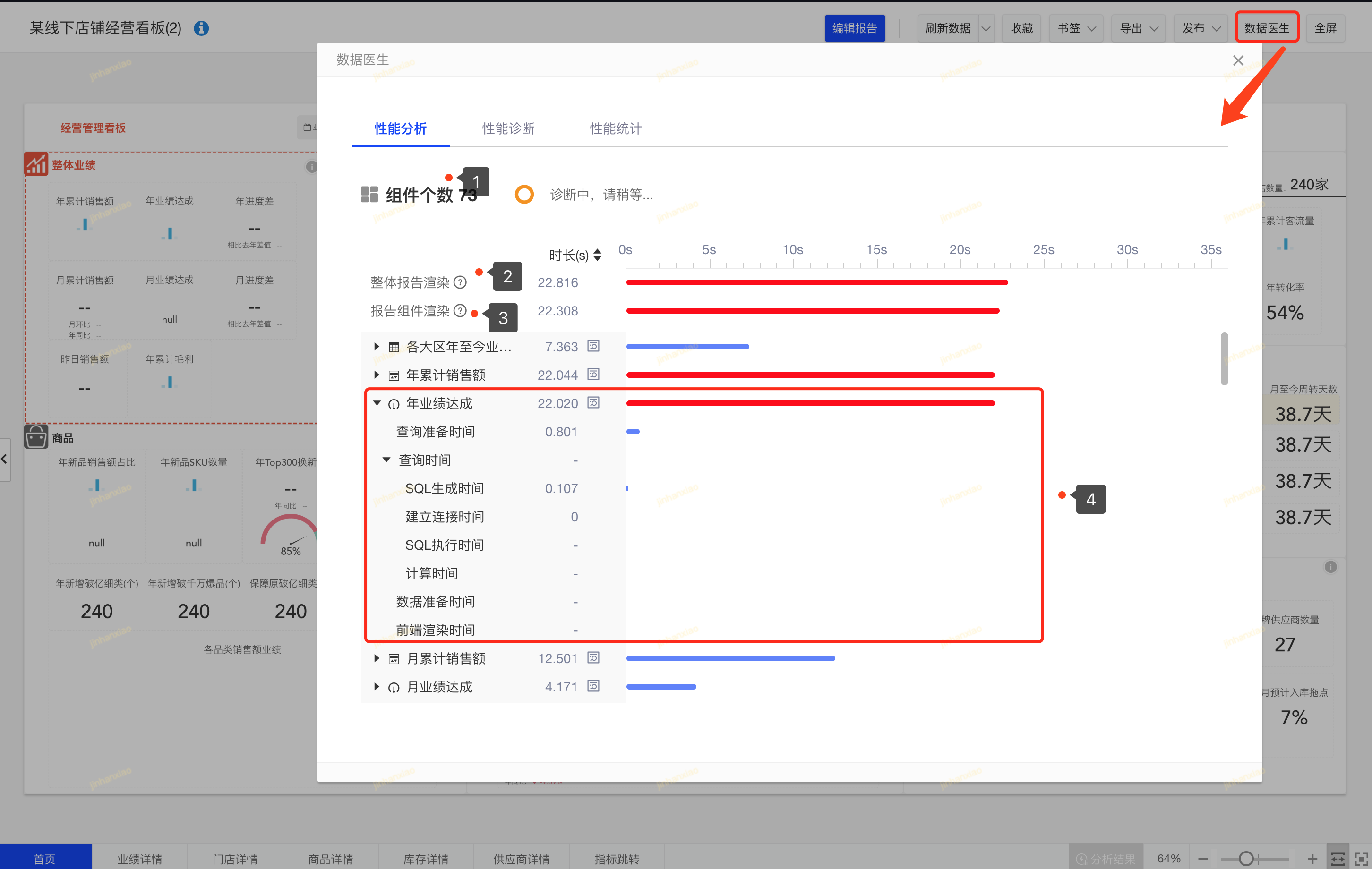 随着报告的加载,数据医生性能分析的时间轴会动态变化,显示当前报告页的每个组件的查询过程及耗时,用户能够快速定位性能慢的阶段,采取针对性优化措施。