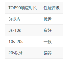 1.根据TOP90响应时间(即90分位数的响应时长数据)判定该报告页的性能情况,不同区间的性能等级为: