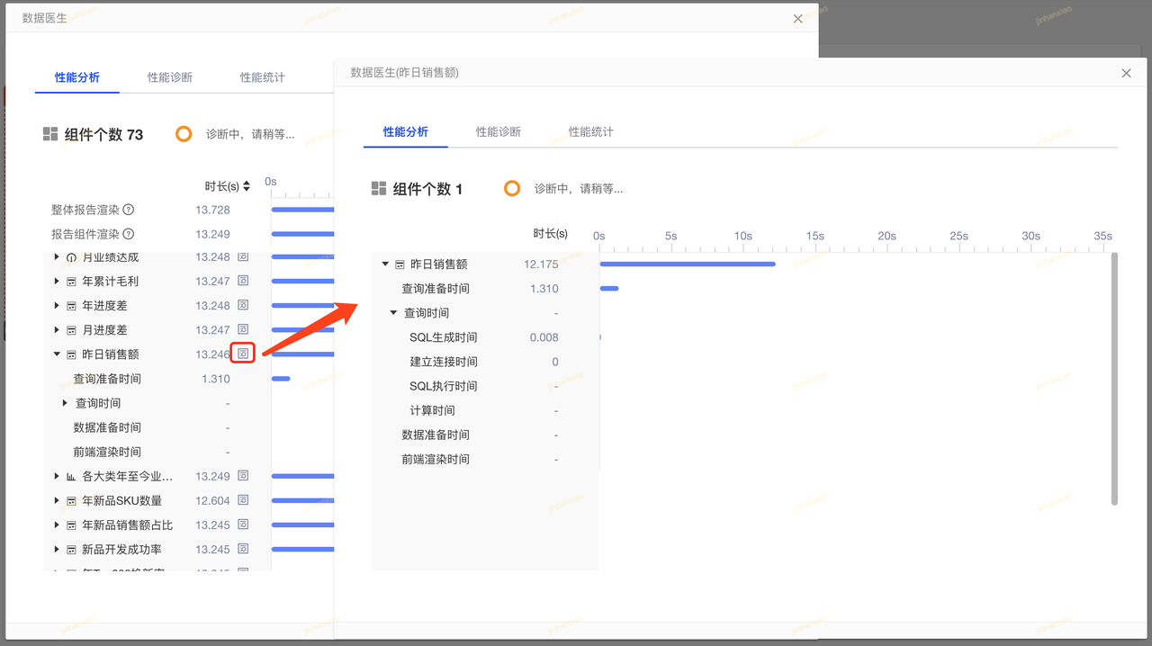 (3)报告数据医生的组件右侧的查询icon点击后亦可查看该组件的性能情况:
