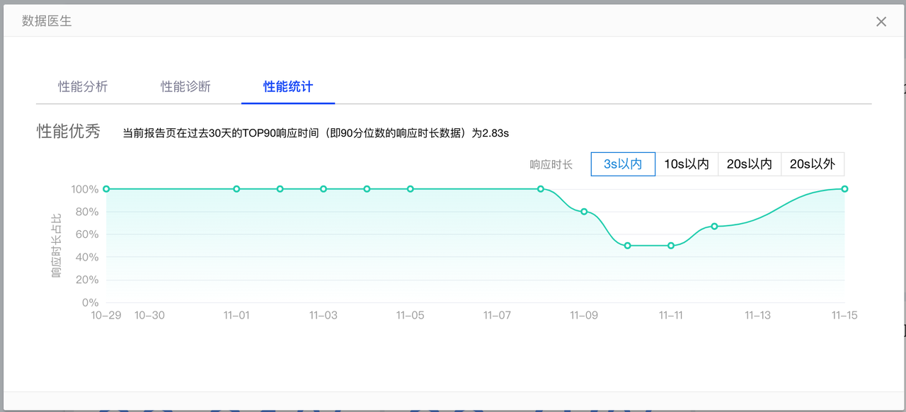根据当前报告页过去30天的响应时长数据统计历史性能趋势,直观展示性能情况。