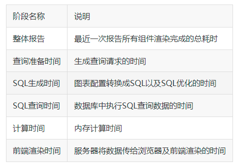 3.报告组件渲染时间展示了各个组件从查询准备到查询、SQL执行、计算、前端渲染等阶段的耗时;