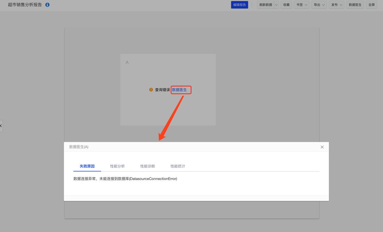 (2)当图表报错时,组件上即有【数据医生】的快速入口,点击后可查看当前图表组件的失败原因、性能分析、异常诊断: