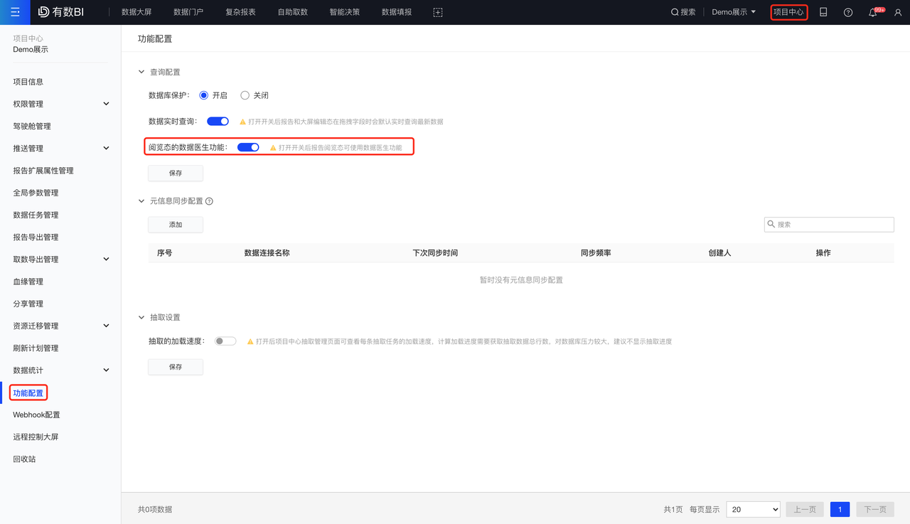 数据医生功能支持编辑报告及阅览报告时使用,若不想让阅览用户使用数据医生功能,则需要项目管理员在项目中心-功能配置中,关闭【阅览态的数据医生功能】: