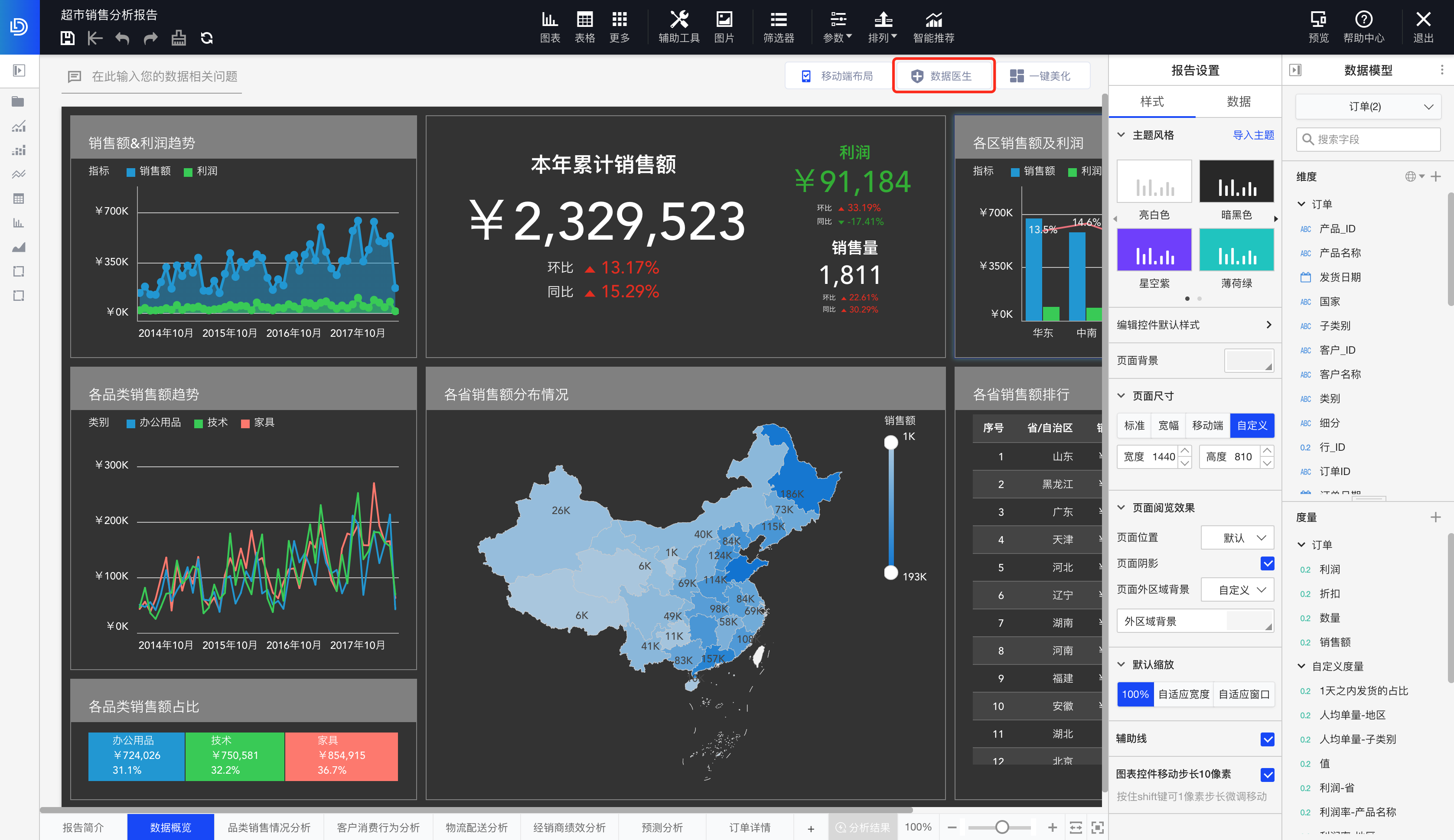 (2)编辑报告时,也可点击【数据医生】按钮(即原来智能诊断按钮),对当前编辑的页面进行性能与数据的诊断: