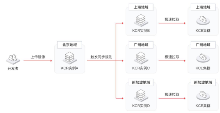 支持在不同地域的不同实例间同步容器镜像,根据规则实现单点推送多地域同步分发,保障用户多地容器业务就近拉取镜像,减少业务部署时间。