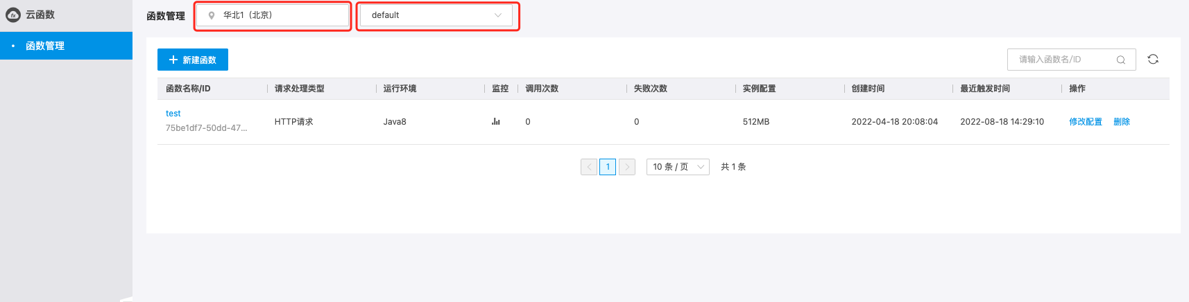您可通过下拉列表切换命名空间,进入不同命名空间的函数管理列表页。