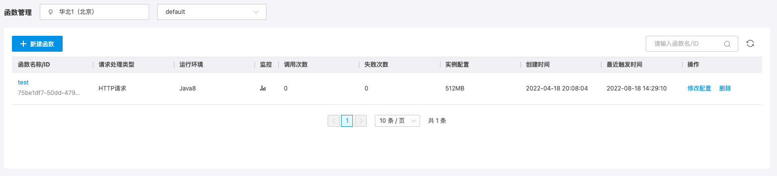 通过函数管理页面函数列表,您可查看函数的关键信息,包含函数名称/ID、请求处理类型、运行环境、监控、调用次数、失败次数、实例配置、创建时间、最近触发时间。