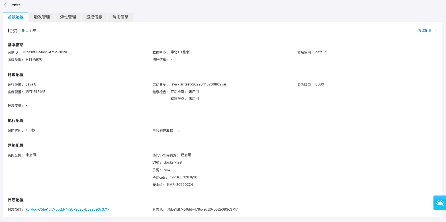 点击函数名称,即可进入函数详情页,在函数配置页签下,您可查看此函数的完整配置信息。