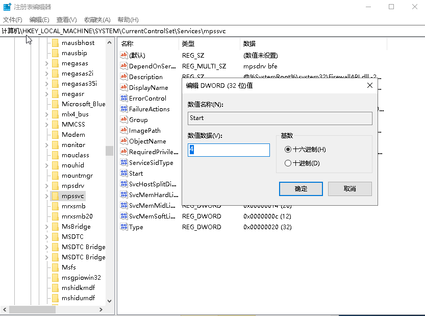 手动修改注册表:运行 -》 regedit -》 计算机\HKEY_LOCAL_MACHINE\SYSTEM\CurrentControlSet\Services\mpssvc -》 Start 将 Start 的值修改为 4。如图所示: