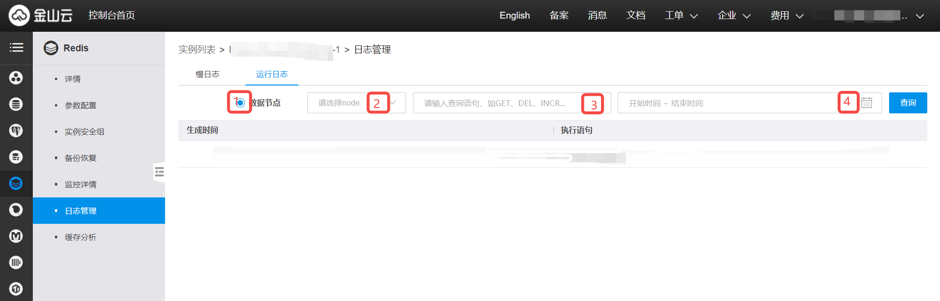 金山云 Redis 的日志管理功能支持查看数据库级别的慢日志,执行时间的单位为ms。