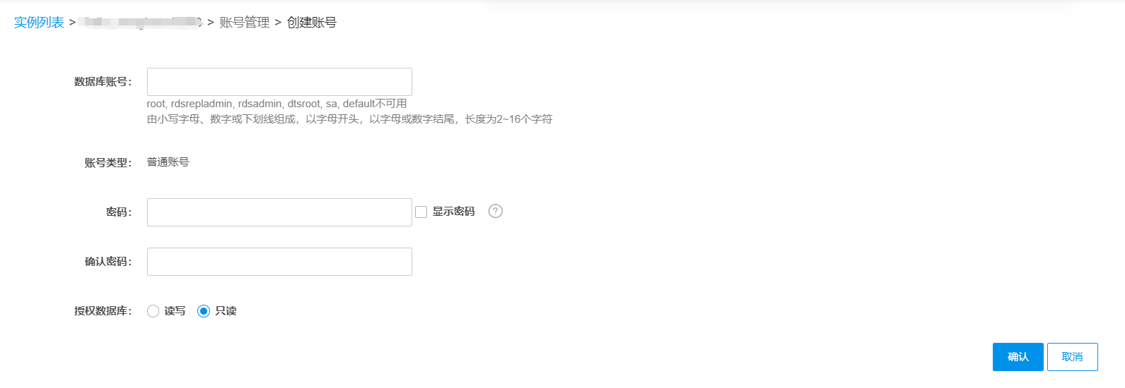 账号创建规则:度为2~16个字符;由小写字母、数字或下划线组成;以字母开头,以字母或数字结尾;不能为root, rdsrepladmin, rdsadmin, dtsroot, sa, default。