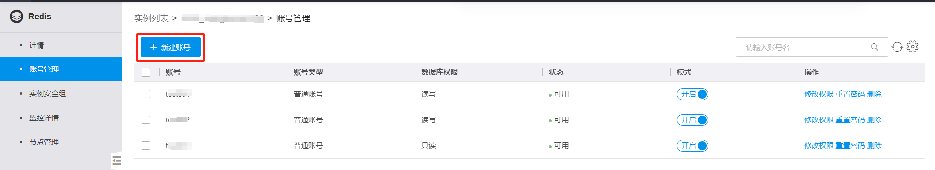 账号类型 | 新建账号固定为普通账号;新建实例时创建的账号为管理员账号,一个实例仅有一个管理员账号,最多可创建20个普通账号。 |