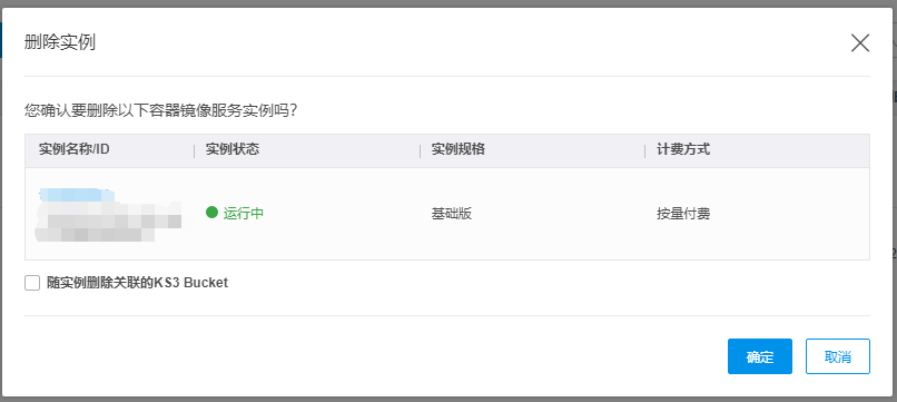勾选删除bucket仅会删除镜像数据,但不删除bucket桶本身,如有删桶需求,请自行前往KS3控制台手动删除。