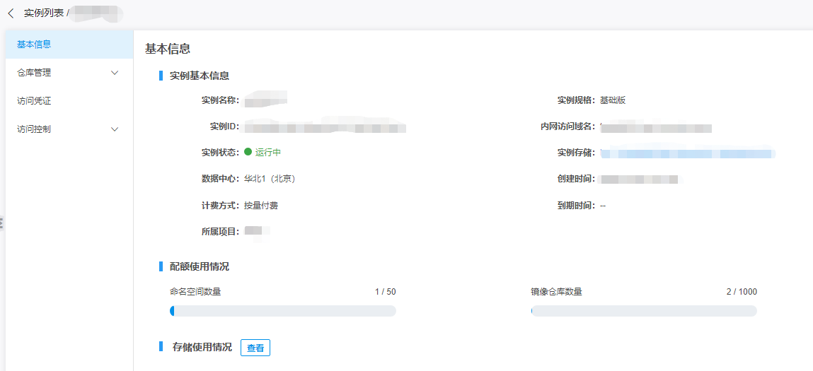 在容器镜像服务实例管理页面左侧导航栏点击基本信息,即可查看相关详情。如下图所示: