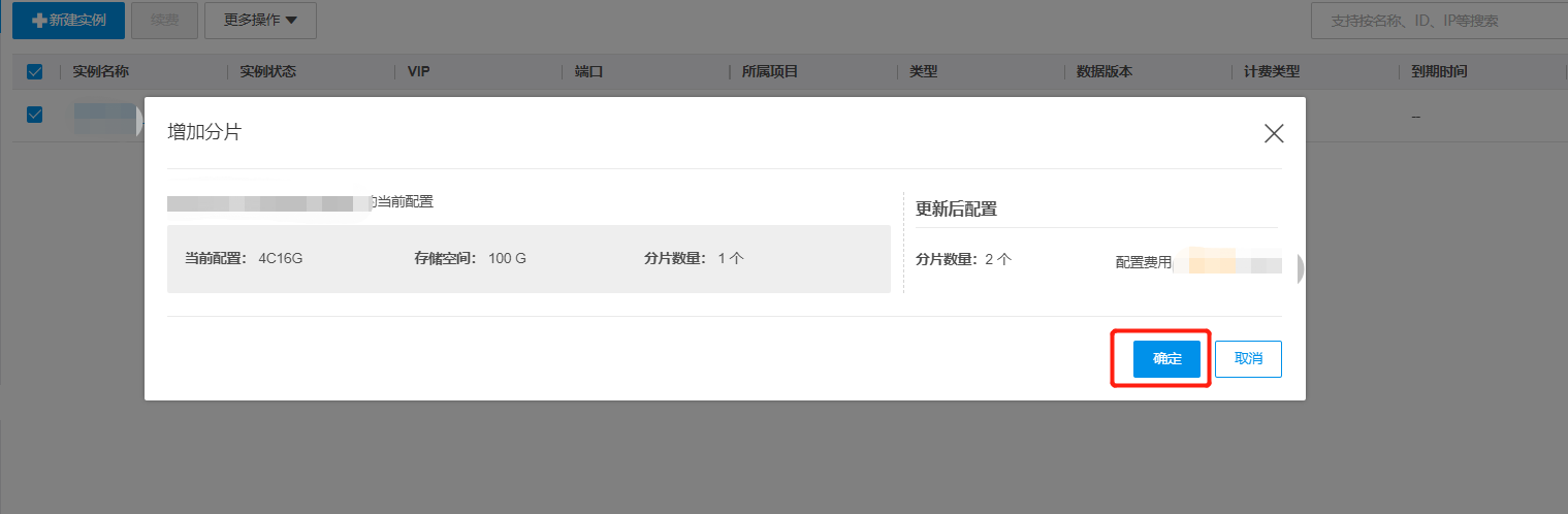 (4)在增加分片窗口,展示增加分片的规格信息,点击“确定”,提交订单后,系统将为您增加分片。