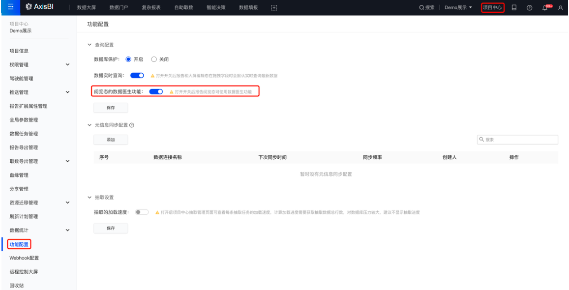 数据医生功能支持编辑报告及阅览报告时使用,若不想让阅览用户使用数据医生功能,则需要项目管理员在项目中心-功能配置中,关闭【阅览态的数据医生功能】:
