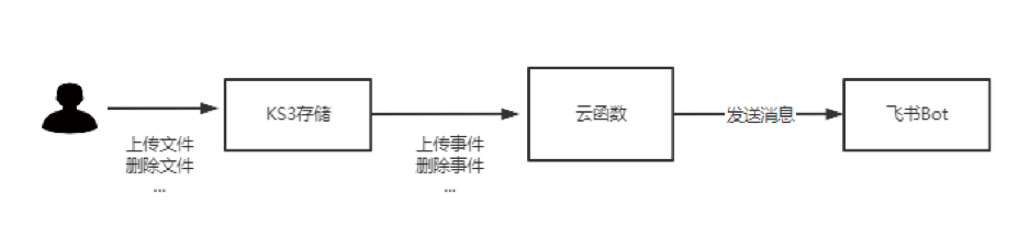 本文介绍如何使用金山云云函数(KCF)实现向对象存储(KS3)上传文件后,自动向飞书Bot推送消息的功能。其中KS3存储用户上传的文件,KCF收到从KS3发送的文件上传事件后,触发执行自动推送文件消息内容到飞书机器人。