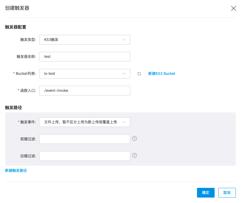 b. 创建触发器,选择指定的Bucket,设置触发规则为文件上传