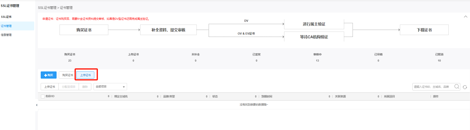 3.在上传证书列表上方,点击上传证书按钮。